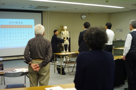 仙骨という骨の上に腰椎が5枚重なっていて、この部分を腰と呼ぶ。24枚の輪が重なっているものを背骨と言う。腰痛の原因はいろいろあるが、背骨周りの筋肉が弱ってきて骨に負担がかかってしまって腰痛になることがある。気功では腰の痛みを取るために広い大きな筋肉を動かして腰痛を治す。気功は身体の後ろの筋肉を使うが、日本人は前を使っているので筋力が落ちてくるとだんだん前傾になり腰に負担がかかってしまう。