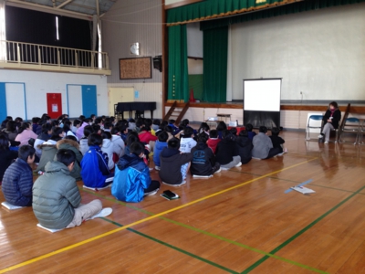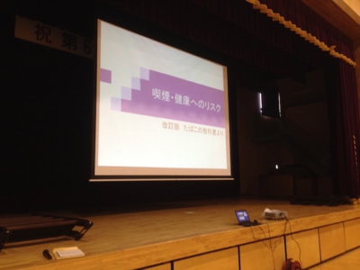 今回は134名と人数が多いので、体育館を使用し、パワーポイント・ビデオで、主に喫煙の健康の害についてお話をしました。
