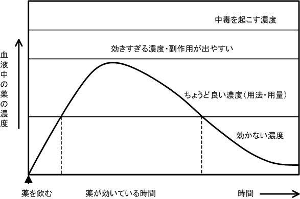 - 薬の成分は計画された血液濃度が続いている時間、医薬品としての効果がある