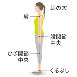 正しい姿勢とは、耳・肩・股関節中央・膝関節中央・くるぶしが、縦に一直線になる姿勢です。