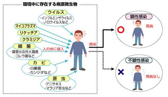 - 感染:ウイルスや細菌などの「病原微生物」が体内に入って増殖した状態。