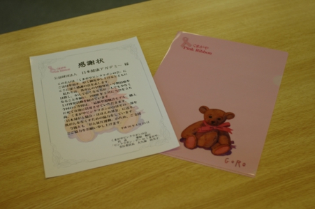 ピンクリボン自販機を埼玉県内で30台置いている。目標は60台。ペットボトル1本で1円から2円の寄付になる。そのうち半分は日本対がん協会のほほ笑み基金という乳がん研究費に寄付されている。