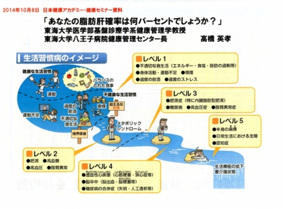 本日の受講者全員に、東海大学医学部付属八王子病院よりこのキットを今回プレゼントする。人間ドックを受けていない人も受けている人も、最新データで脂肪肝確率を把握してほしいので、是非このキットで自己検診して脂肪肝確率を計っていただきたい。