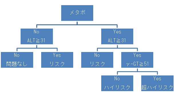 メタボ検診では単にメタボか否かしか議論しないが、ALT・γ-GTの値を見ることで、そのリスクの度合いが見えてくる。但し、飲酒者ではγ-GTの値が高いので、ハイリスク・超ハイリスクの区別がつかない