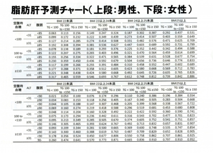- 脂肪肝の有無を予測するインデックス及び脂肪肝予測チャートを開発した。