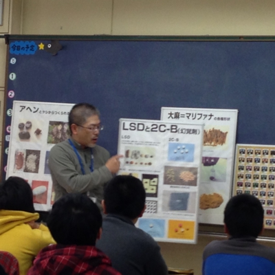 参観を頂いた校長先生から、「脱法ハーブ」の取り締まりについて質問され、「法で規制できないように化学式をモディファイされた幻覚剤等をブレンドしているので、にわかに法規制することは難しい。むしろ、生徒には法で規制されているいないに係らず薬物の効果を楽しむ為の乱用自体が、やってはならないことで、それをやらないことを自分自身で判断できなければいけないことを説いている。」ことを説明し、校長先生にも、このような地道な活動が重要であることをご理解いただきました。