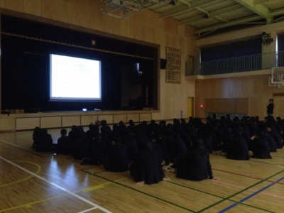 今回は134名と人数が多いので、体育館を使用し、パワーポイント・ビデオで、主に喫煙の健康の害についてお話をしました。