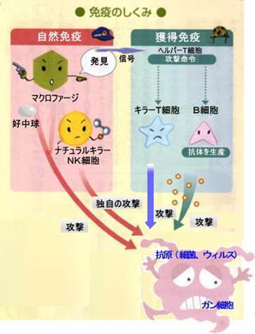自然免疫:抗原(ウイルスや細菌)が体に入ると免疫細胞が戦って抗原をやっつけるが、免疫力が落ちていると抗原に負けてしまう