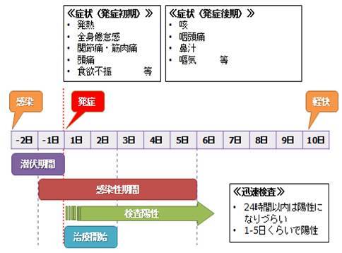- 2日程度潜伏期間があり、感染期間は5日ほどである。24時間以内は陽性になりづらく1-5日で陽性になる。薬を飲んで熱が下がっても3日ほどはウイルスを出し続けている。