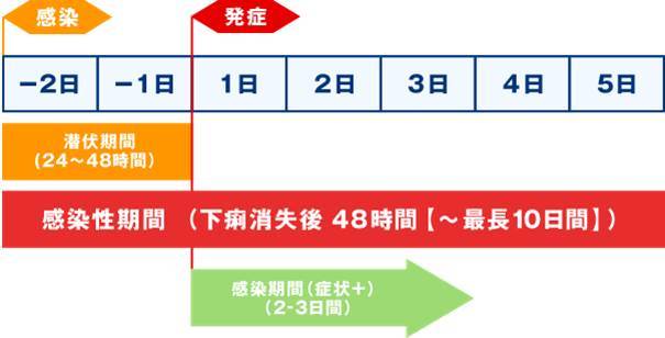 - 2日程度潜伏期間があり、症状としては急に嘔吐と下痢が起こり症状の出る感染期間は2-3日ほどである。とてもつらく高齢者や小児は脱水症状になる恐れがある。下痢消失後48時間~最長10日間は感染性期間とされている。