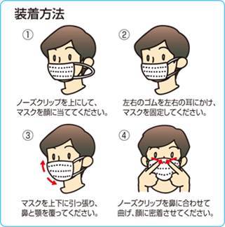 - マスクの着用は鼻からあごまでしっかりと隠す。ワイヤーをしっかり鼻に当て、マスクを広げて着用する。