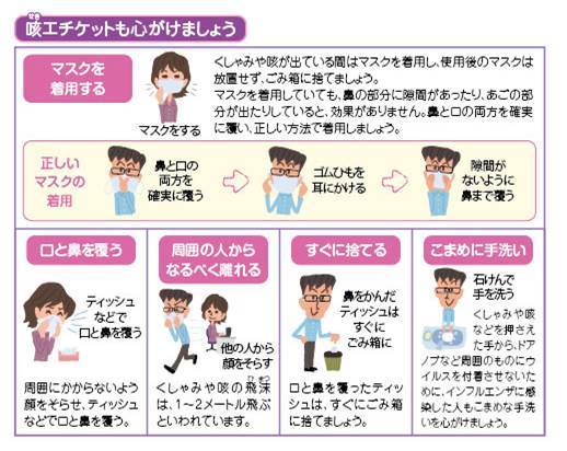 - 職場の人にうつさないために、熱が下がってから2日間は出勤しない・マスクをする・咳をしたマスクや鼻をかんだ紙は感染源すぐにゴミ箱へ・手についたインフルエンザウイルスは石鹸で死ぬ。手を石鹸で洗い、流水で洗い流す。